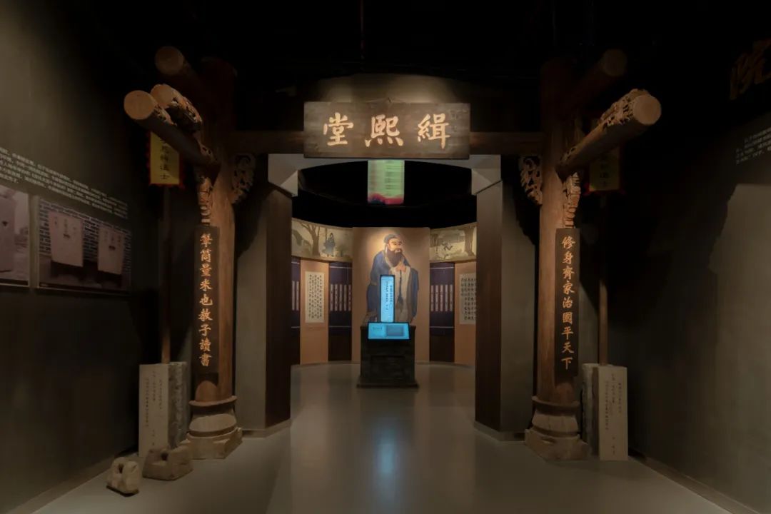 該展區主要陳列展示恩平教育發展歷史成果以及古代的官吏名人。步入文教興盛單元,歷史遺存的匾額赫然入目,兩根筆筒形狀的立柱鐫刻歇馬村祖訓,兩側圖文展板結合書院牌匾和歷史文物,展示古代恩平的著名書院,以及對文教興盛和文化傳承的高度重視。弧形中心設置歇馬村標志性旗桿,上方設計多媒體顯示屏,循環播放歇馬村八大旗桿內容,頂端設計玉斗,寓意才高八斗。旗桿后方懸掛孔子畫像,背景設計為弧形書架,寓意歇馬村崇文重教的風尚。書架上方的弧形墻面,設計古代科舉過程,采用環形畫的方式,再現古代學子登科的過程,使參觀者了解古代考取功名的艱辛歷程。歷史先賢部分,以獨立空間展示恩平先賢,中間設計梁元桂雕像,兩側采用圖文、人物造型等手段,展示其生平介紹等內容,頂部采用歇馬村勵學制為原型進行藝術設計,再現先賢生平,與整個展區相互呼應。