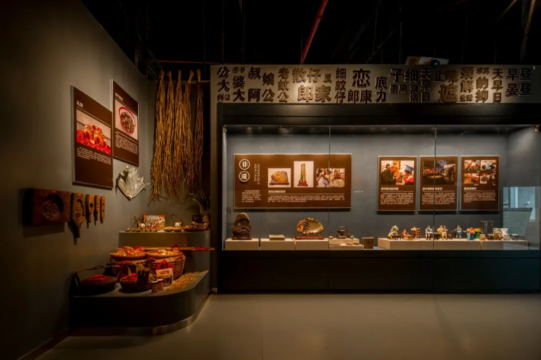 進入本展區,首先看到的是傳統文化節日展,通過圖文展板與實物陳列等手法,展示攔火社、中秋節、端午節等節日活動內容。婚嫁單元,采用場景還原的手法,結合智能調光玻璃系統,展示恩平傳統風俗,觸發感應區透明玻璃變為顯示系統,參觀者可欣賞恩平婚禮過程。非遺單元采用通壁展柜結合圖文展板展示省級非遺,上方設計恩平稱謂用語,同時在此處設置互動點播系統,“跟我學唱恩平民歌”和“跟我學說恩平話”,在互動中尋找樂趣。