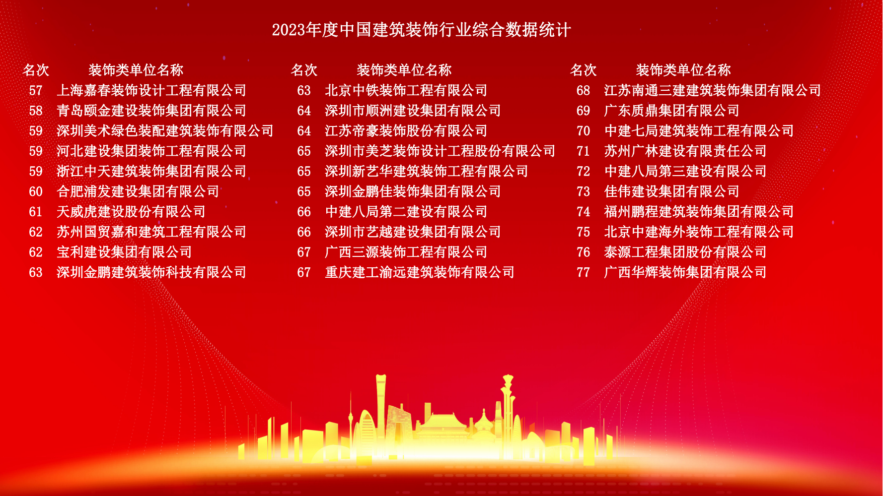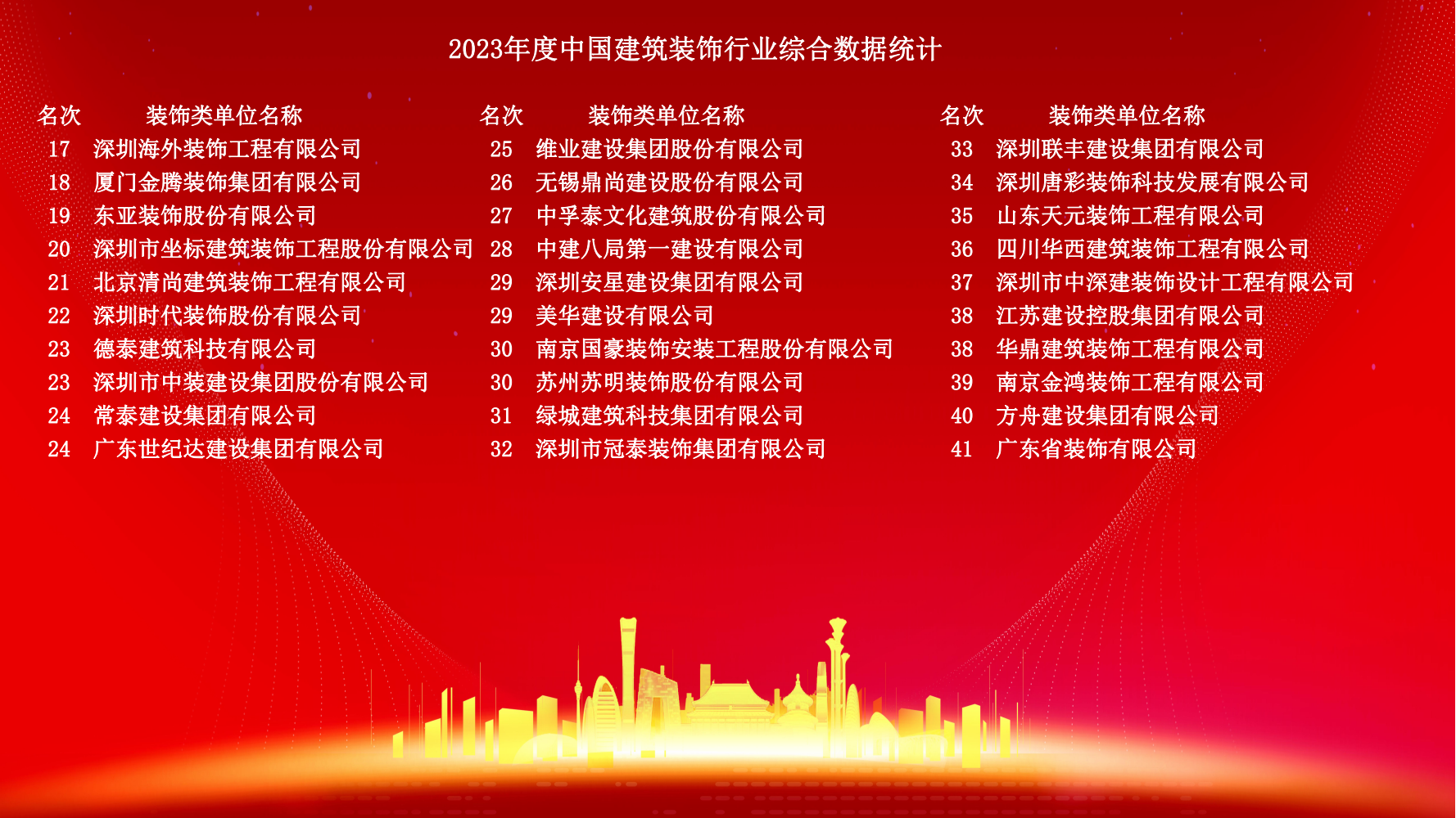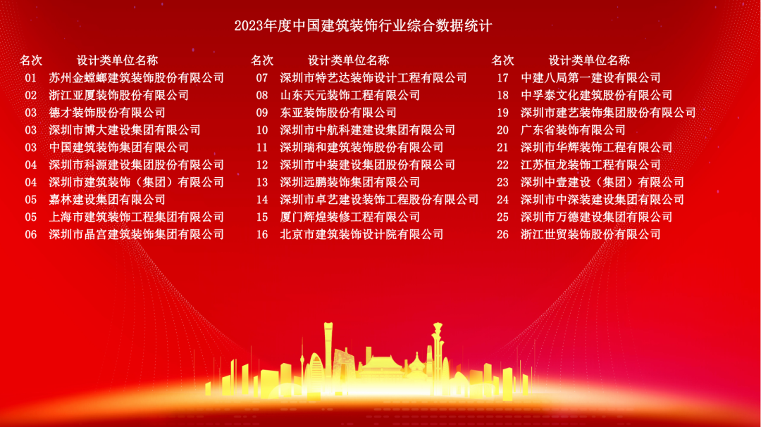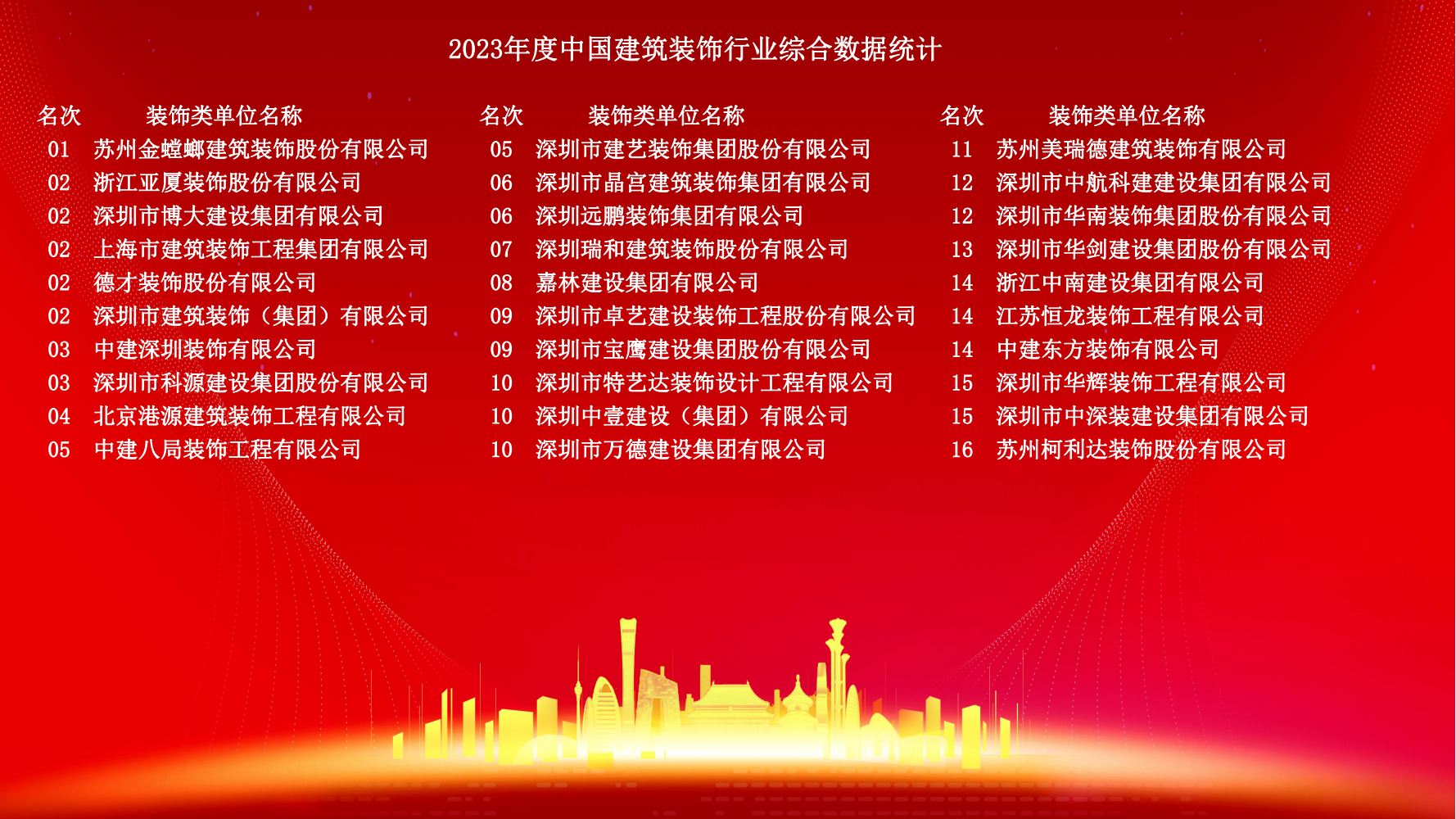12月10日,2023年度中國建筑裝飾協(xié)會行業(yè)綜合數(shù)據(jù)統(tǒng)計(jì)正式發(fā)布。詳細(xì)名單如下: