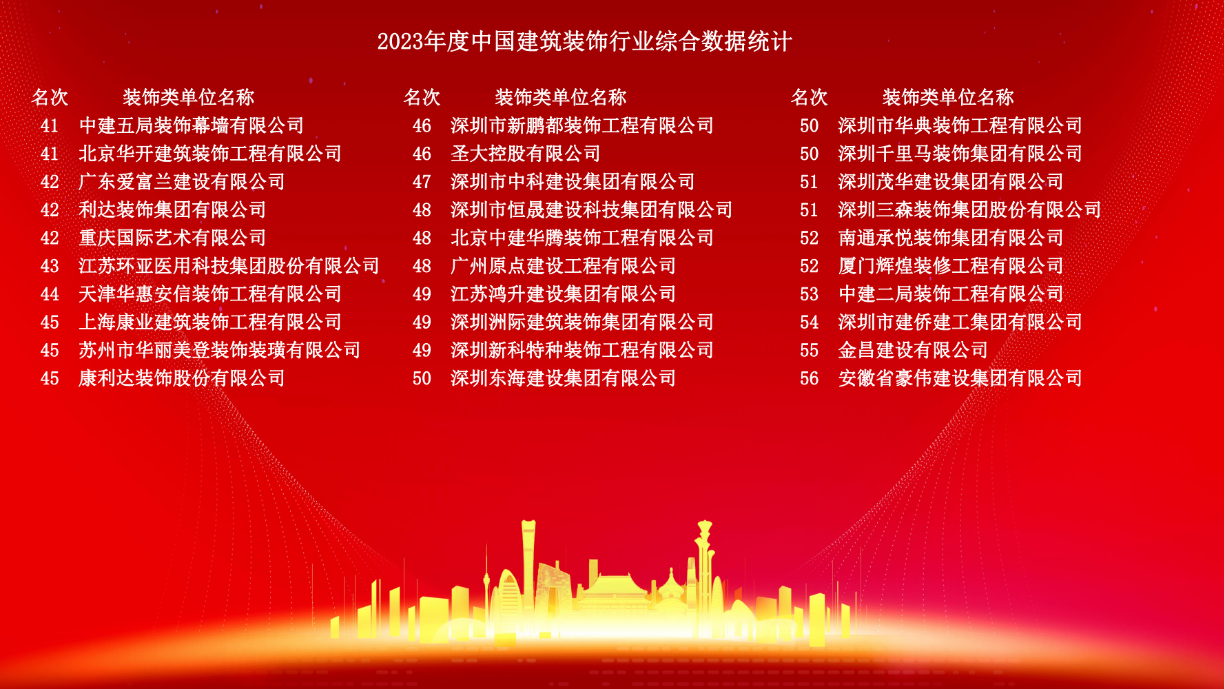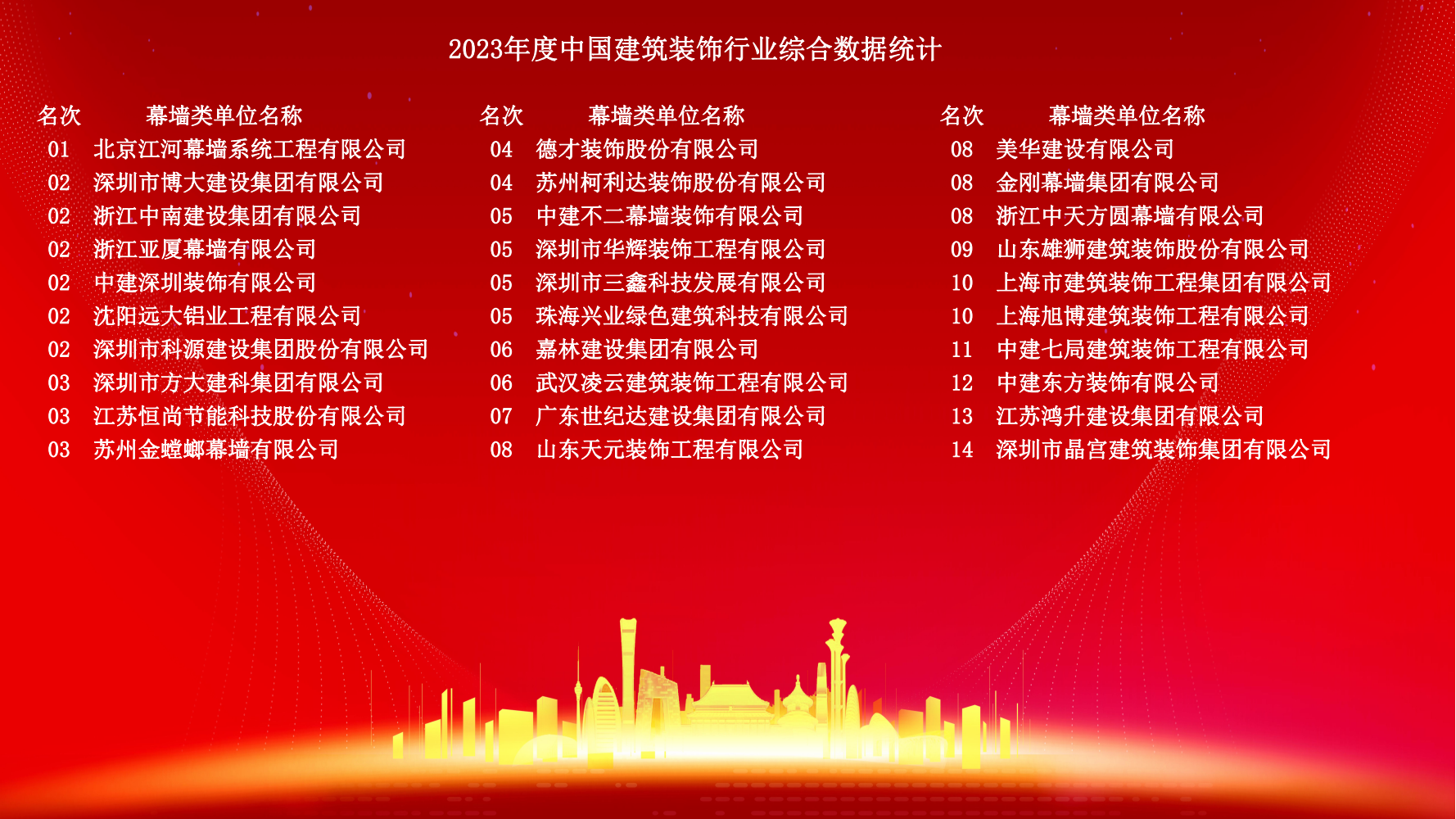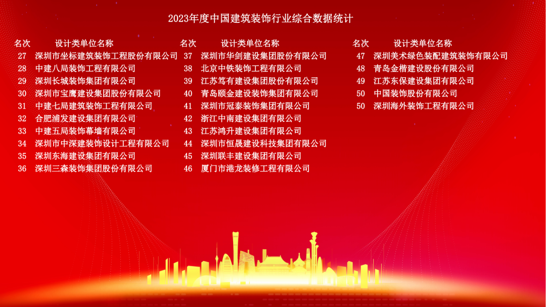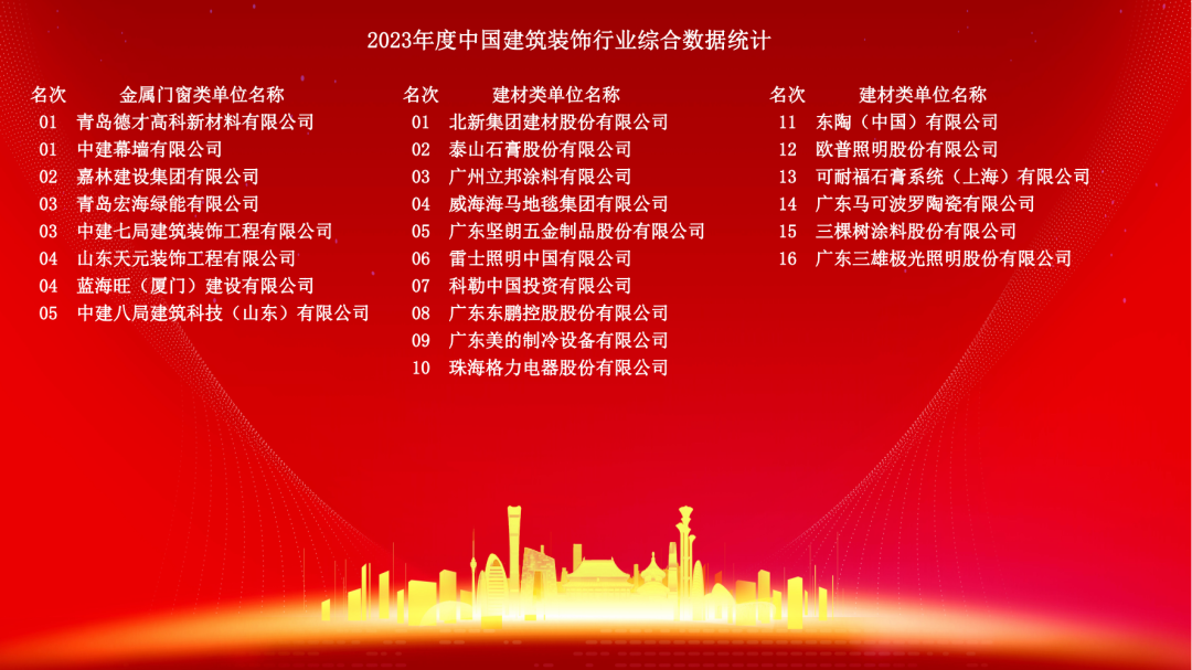 12月10日,2023年度中國建筑裝飾協(xié)會行業(yè)綜合數(shù)據(jù)統(tǒng)計(jì)正式發(fā)布。詳細(xì)名單如下: